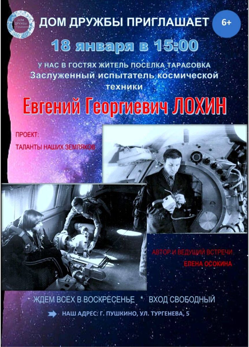 Пушкино Московской области 18 января 2026 года! 📌ДОРОГИЕ ДРУЗЬЯ! 📌 ДОМ ДРУЖБЫ г. Пушкино приглашает вас на творческую встречу в рамках проекта "ТАЛАНТЫ НАШИХ ЗЕМЛЯКОВ". Наш гость Евгений Георгиевич ЛОХИН - Заслуженный испытатель космической техники, житель поселка Тарасовка. Ведущая вечера – краевед Елена Осокина. Вы узнаете, как начался путь Евгения Лохина в космическую отрасль, о людях, которые встречались на этом пути, о задачах, решаемых подразделением испытателей, куда он попал, о том, зачем нужна летающая лаборатория, как создавался специальный космический инструмент, как работают космический резак и инерционный молоток, что такое «динозаврики». Евгений Георгиевич расскажет, как решают испытатели космической техники задачи по отработке штатных операций в открытом космосе и отработку операций в случае возникновения нештатных ситуаций на борту космического корабля. Ждем вас в воскресенье, 18 января, в 15 часов в Доме Дружбы по адресу: ул. Тургенева, 5. ВХОД СВОБОДНЫЙ. https://t
