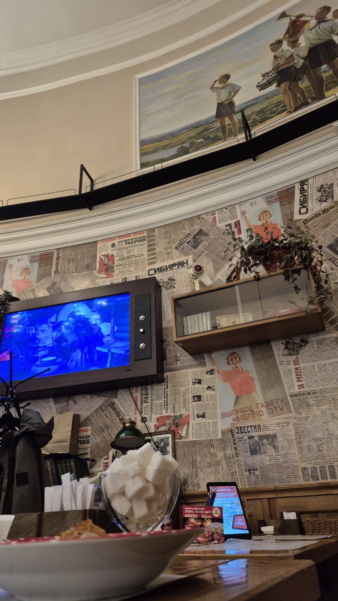 Стены украшали плакаты времен СССР, старые афиши кинофильмов и концерты артистов тех лет. Над столиками висели массивные люстры с абажурами, словно перенесенные прямо из гостиничного холла советской эпохи. По углам стояли стеллажи с книгами, журналами и даже старыми граммофонами, вызывая чувство легкой ностальгии.