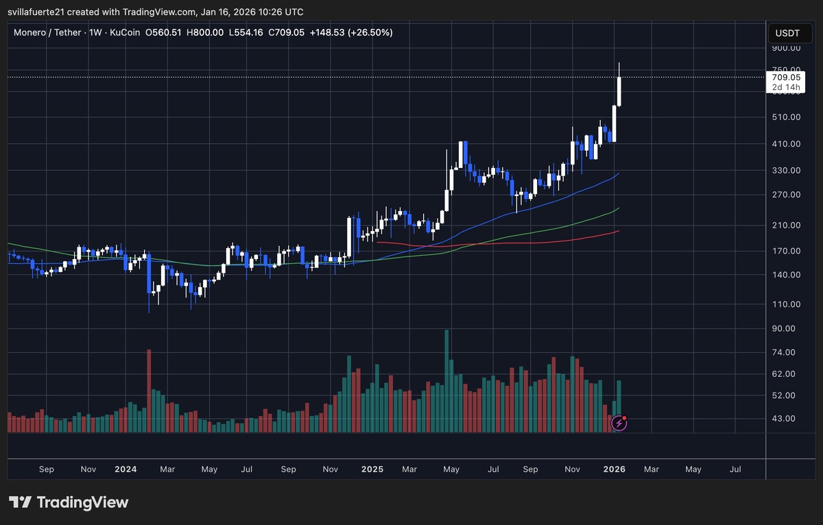 С начала 2026 года Monero (XMR) продемонстрировал впечатляющий рост с $410 до почти $799, что является одним из сильнейших движений на рынке за последние несколько дней. Этот прорыв происходит после аналогичных резких ралли Zcash (ZEC) и Dash (DASH), которые также испытали взрывной рост с последующими быстрыми откатами. Всплеск Monero теперь начинает демонстрировать те же признаки «розничного ажиотажа», что и у других конфиденциальных монет, поднимая вопросы о долгосрочной устойчивости этого движения. 📊 Ключевые моменты: - 📈 XMR вырос с $410 до $799 с начала года. - ⚠️ Сигнал о розничной активности появился, когда XMR торговался около $714. - 📉 Zcash ранее достигал $698, а затем упал примерно на 37% до $442. - 📉 Dash достигал $120, а затем упал примерно на 52% до $57.