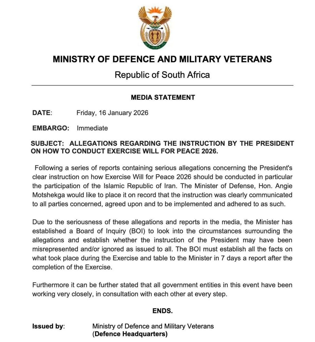 Министр обороны Южной Африки подтвердил, что президент Рамафоса издал приказ о продолжении участия Ирана в учениях Will for Peace 2026, и