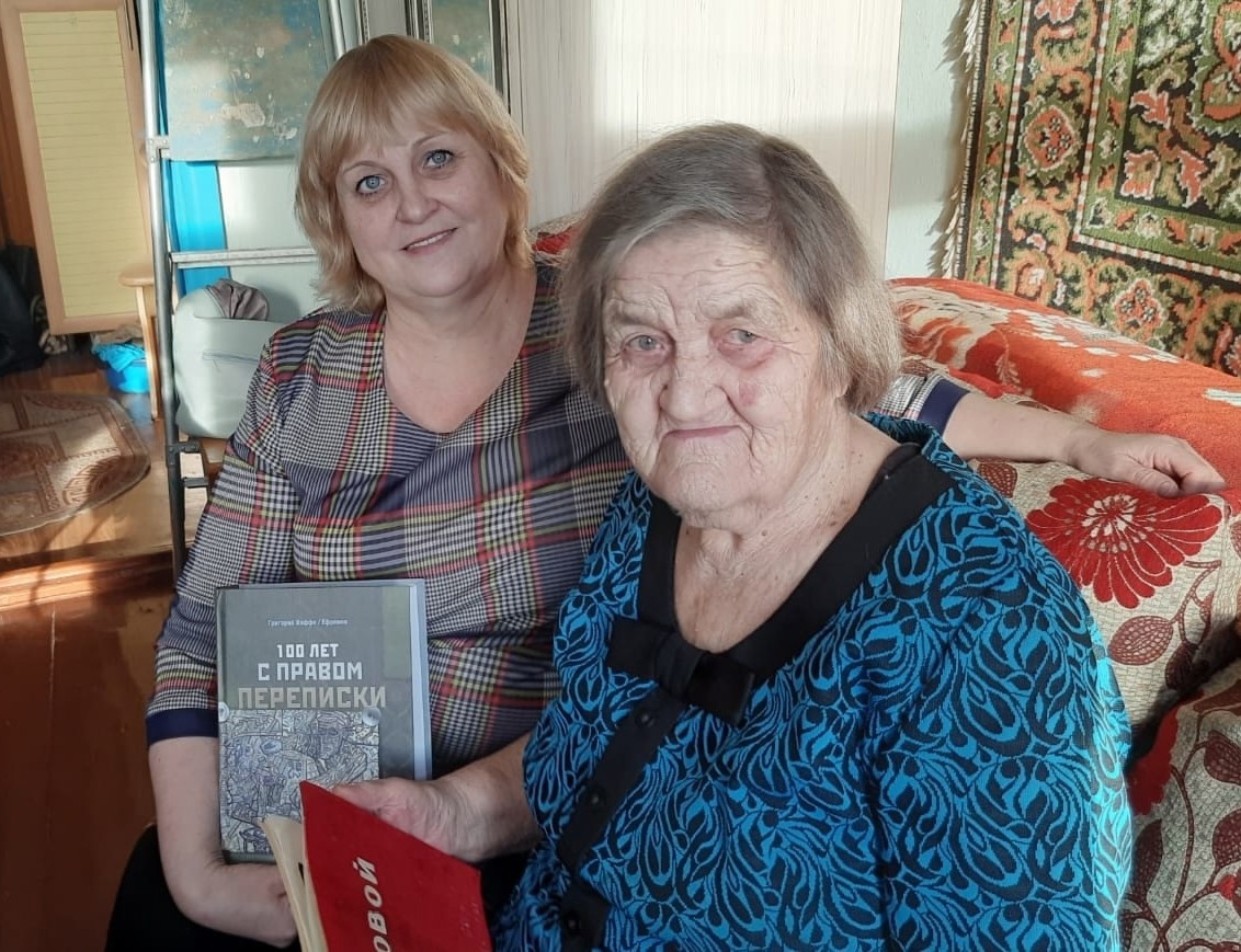 На фото главные героини этого романа: Лариса Валерьевна Сопова (слева) и Антонина Павловна Конева, учитель школы № 1 города Карабаша, организовавшая в 1970 году переписку пионеров школы с Ксенией Герасимовной Ефремовой, моей бабушкой. С книгой «100 лет с правом переписки» и альбомом, который ребята прислали бабушке в 1971 году