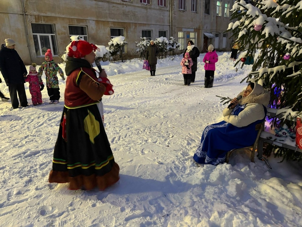 ΡΠΊΠ°Π·ΠΎΡΠ½ΡΠΌΠΈ ΠΏΠ΅ΡΡΠΎΠ½Π°ΠΆΠ°ΠΌΠΈ. Π ΠΏΡΠΎΠ³ΡΠ°ΠΌΠΌΠ΅ ΠΏΠΎΡΠ²ΠΈΠ»ΠΈΡΡ Π»ΡΠ±ΠΈΠΌΡΠ΅ Π³Π΅ΡΠΎΠΈ ΡΠΊΠ°Π·ΠΎΠΊ: ΠΠ°Π±Π° Π―Π³Π°, ΠΠ°ΡΡΡΡΠ΅Π½ΡΠΊΠ°-ΠΡΡΠ΅Π½ΡΠΊΠ°, ΠΠ΅Π΄ ΠΠΎΡΠΎΠ· ΠΈ Π‘Π½Π΅Π³ΡΡΠΎΡΠΊΠ°. ΠΠ½ΠΈ ΡΠΎΠ·Π΄Π°Π»ΠΈ Π²ΠΎΠ»ΡΠ΅Π±Π½ΡΡ Π°ΡΠΌΠΎΡΡΠ΅ΡΡ. Π ΠΊΠΎΠ½ΡΠ΅ Π²ΡΠ΅ Π²Π·ΡΠ»ΠΈΡΡ Π·Π° ΡΡΠΊΠΈ ΠΈ ΡΠΏΠ΅Π»ΠΈ Π½ΠΎΠ²ΠΎΠ³ΠΎΠ΄Π½ΠΈΠ΅ ΠΏΠ΅ΡΠ½ΠΈ. βΒ«ΠΡΠΎΡΠ°Π½ΠΈΠ΅ Ρ ΡΠ»ΠΊΠΎΠΉΒ» ΡΡΠ°Π»ΠΎ Π΄ΠΎΠ±ΡΠΎΠΉ ΡΡΠ°Π΄ΠΈΡΠΈΠ΅ΠΉ ΠΡΠ»ΠΎΡΠΈΠ½ΡΠΊΠΎΠ³ΠΎ ΠΠΎΠΌΠ° ΠΊΡΠ»ΡΡΡΡΡ, ΠΏΡΠΈΠ½ΠΎΡΡ ΡΠ°Π΄ΠΎΡΡΡ ΠΈ Ρ