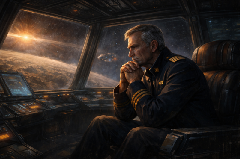 Капитан Ирвинг сидит в рубке, подперев рукой белёсую, уже начинающую седеть голову. На мгновение он бросает взгляд в иллюминатор: внизу висит пыльная, безжизненная Ке-47, тускло подсвеченная локальным солнцем. В рубке прохладно — двадцать один градус, как он любит. От кителя едва уловимо тянет дорогим одеколоном.