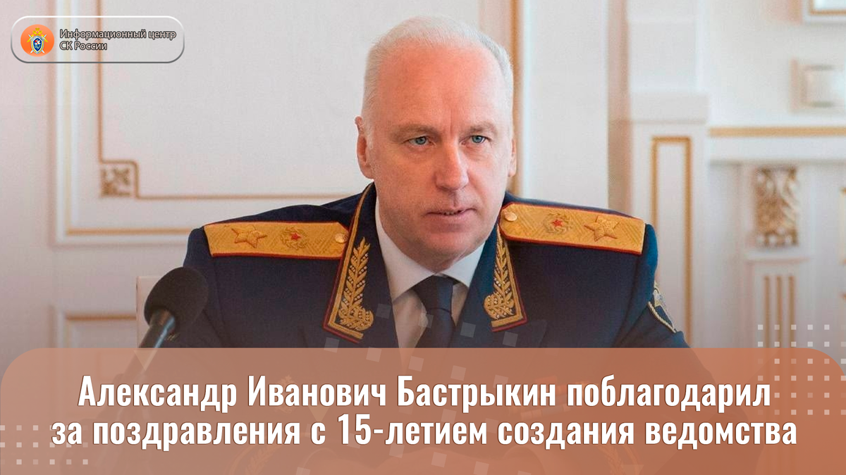 Александр Иванович Бастрыкин поблагодарил за поздравления с 15-летием создания ведомства От лица коллектива Следственного комитета Российской Федерации и от себя лично выражаю благодарность за теплые слова поздравления с 15-летием создания нашего ведомства. Добрые пожелания в адрес ведомства и его сотрудников прозвучали от глав федеральных министерств и ведомств, представителей органов государственной власти, юридического сообщества, научной сферы, деятелей культуры и искусства, общественных организаций. Очень ценно признание со стороны ветеранов следствия – мы благодарны вам за бесценный опыт, мудрость и ту прочную основу, на которой стоит современный Следственный комитет. Мы продолжаем ваше правое дело. Отрадно получать отклики от участников специальной военной операции, которые выполняют важные государственные задачи. Такая поддержка - не только оценка пройденного пути, но и аванс на будущее, который обязывает нас работать ещё эффективнее и самоотверженнее. Мы подводим итоги и начи