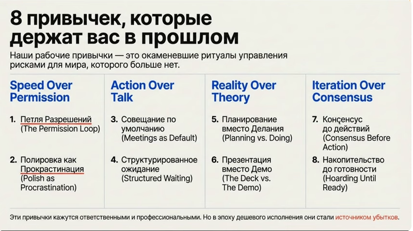 Ключевой кусок — восемь устаревших привычек. Раньше они защищали дорогую разработку от ошибок. Сейчас — они тормозят систему сильнее, чем сами ошибки.
