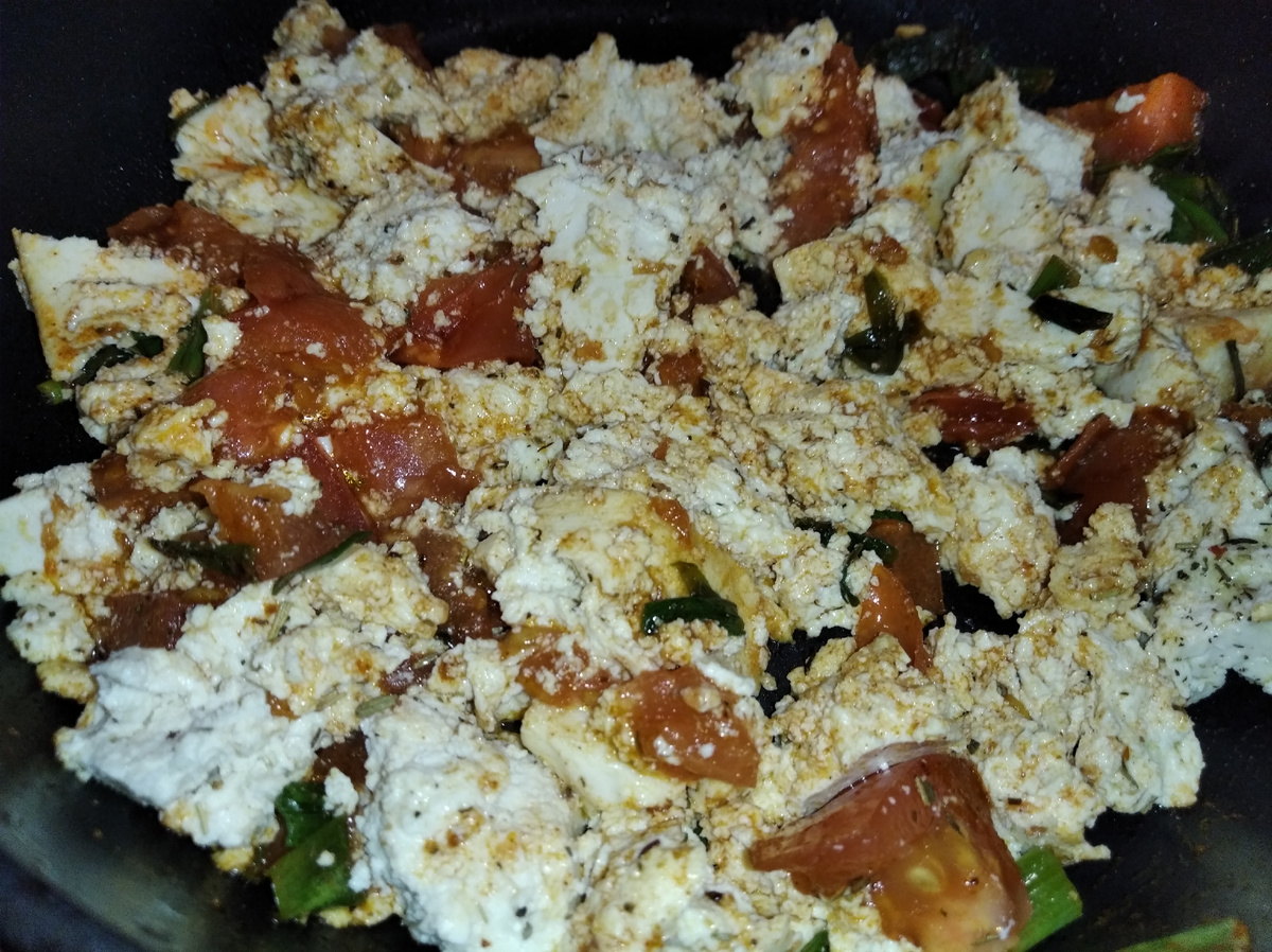 Начнем с того, что такое скрэмбл. Это яичница-болтунья, пожаренная быстро быстро на сковороде, может быть даже не до полного приготовления яиц. Часто ее готовят с овощами и кладут на тост. Я же приготовила скрэмбл из тофу, так как яйца я не ем. Это тоже получилось очень вкусно и сытно, а готовится очень легко. Из овощей у меня были только томаты и зеленый лук из морозилки, с ними и готовлю. На столовой ложке растительного масла я пожарила томаты минут пять, к ним добавила лук, прогрела еще минуты две, специи еще в виде копченой паприки и соли. Тофу покрошила руками и кинула сюда же, все вместе перемешала пару раз. Тост я не хотела на завтрак, поэтому смешала тофу с цельнозерновыми макаронами. Как же это вкусно! Не забыла в виде топпинга квашеную капусту, я ее ем каждый день. Попробуйте приготовить. Времени у меня все приготовление заняло минут десять, так как макароны были приготовлены заранее, если их здесь и сейчас варить, то минут пятнадцать. Всем приятного аппетита и хорошего дня.