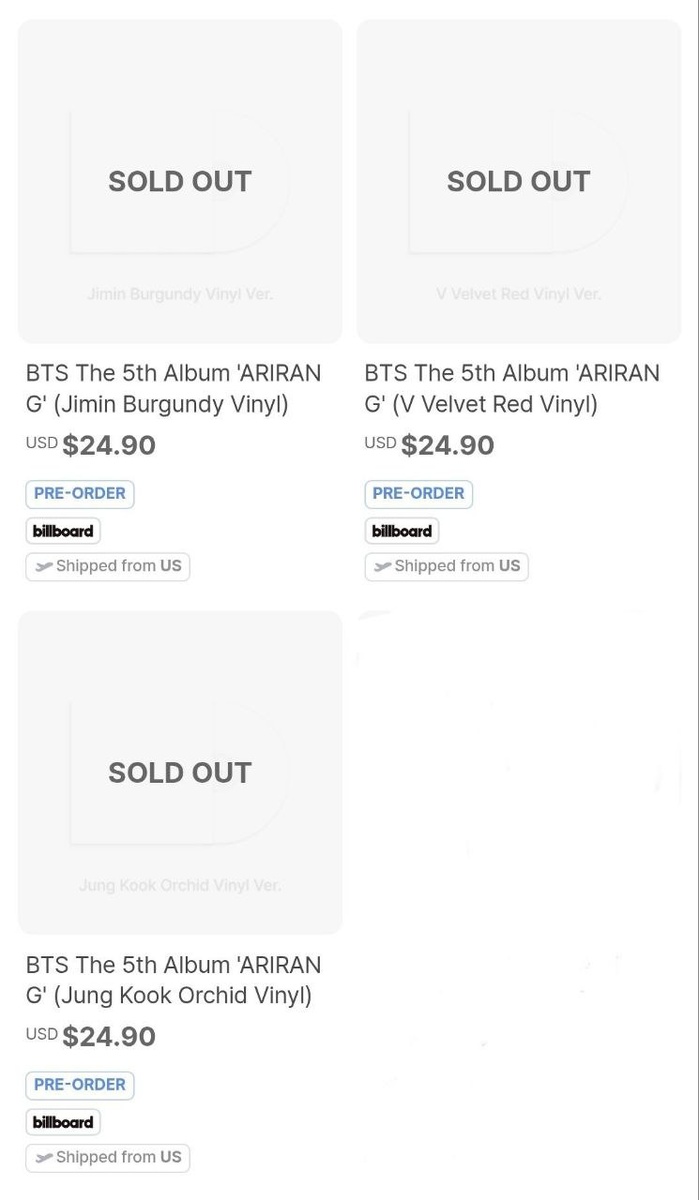🫧 Все 7 версий винила "Arirang (Standard Vinyl)" были полностью распроданы на Weverse США всего за 20 минут после старта официального предзаказа.