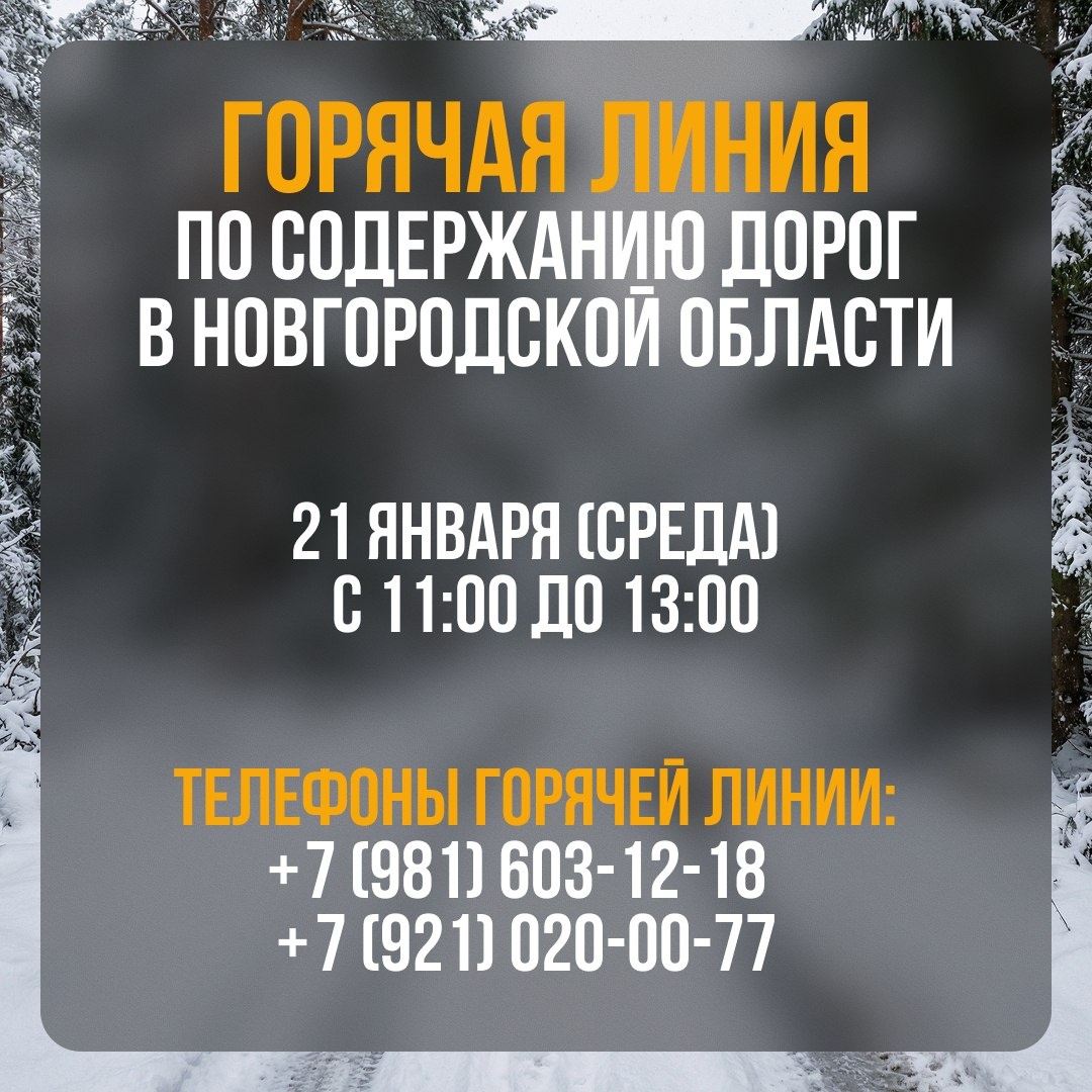 ❗️ В среду, 21 января, в Новгородской области будет работать «горячая линия» по вопросам содержания дорог