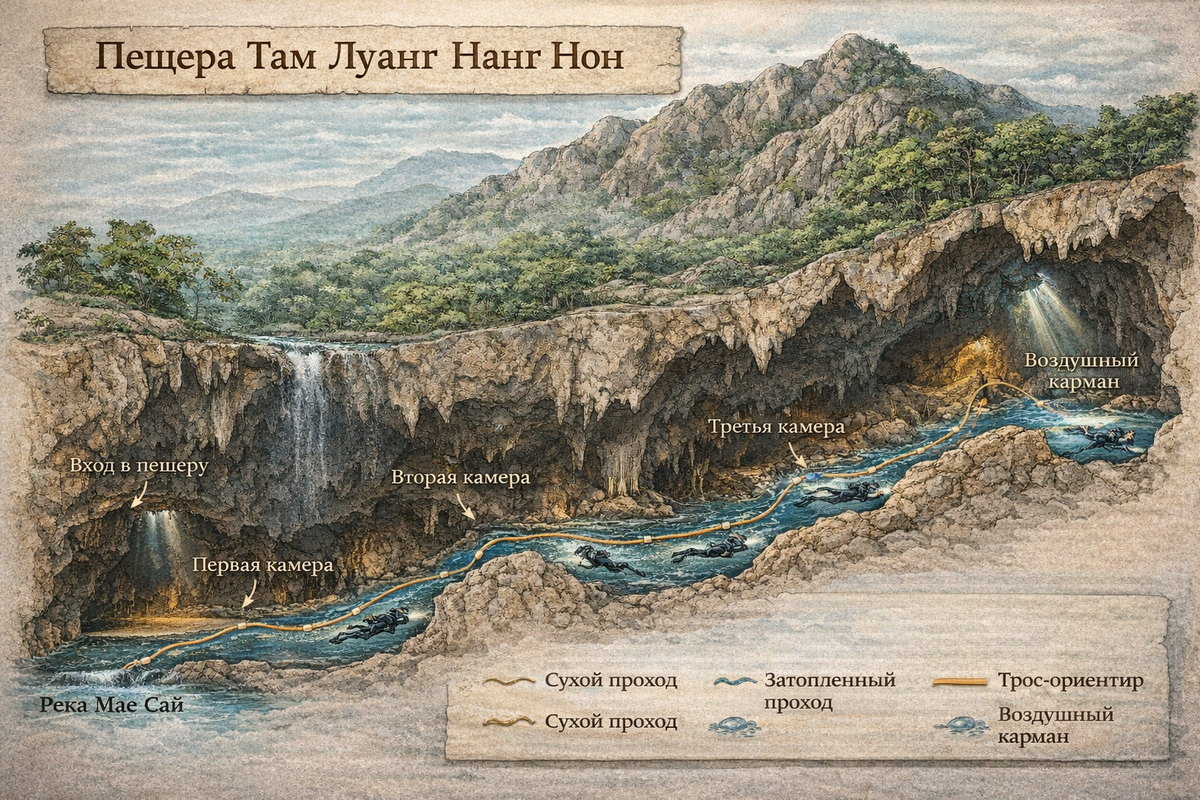 Затем доброволец-дайвер осторожно увёл Нота под воду. Одной рукой он держался за направляющий трос — единственную нить, ведущую сквозь мутную, непроглядную темноту. Другой рукой он прижимал мальчика к себе, словно защищая его собственным телом. Путь наружу был сложным и изматывающим: затопленные коридоры сменялись сухими или наполовину залитыми камерами, потолки опускались, стены сжимались, а течение не отпускало.