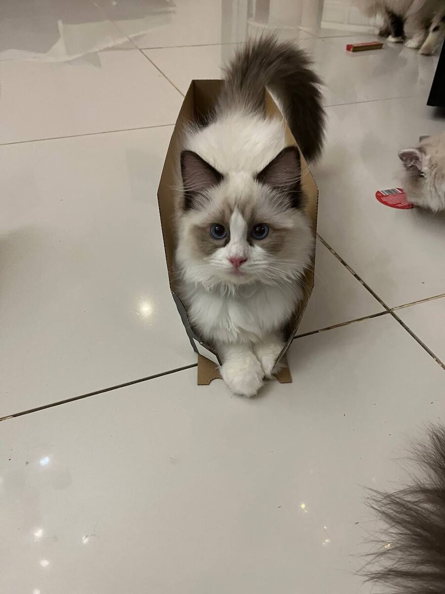 Злая женщина лишила котика жилья и выкинула коробочку 😁 А ему она была как раз! Он любит в обтяжку 😉