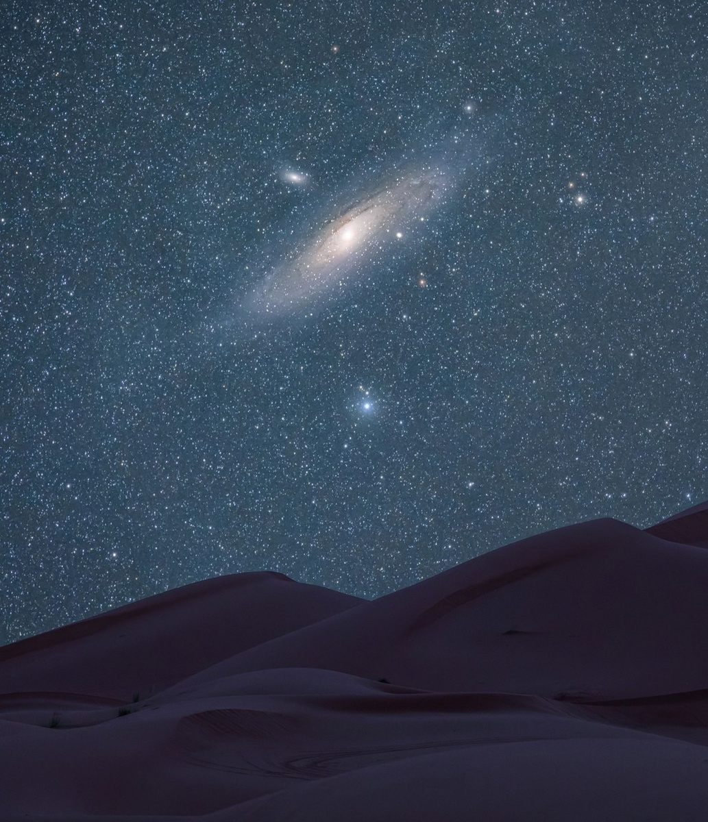 Композитное изображение галактики Андромеды на фоне песчаных дюн Сахары