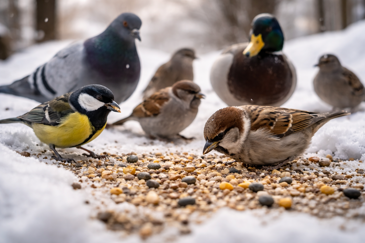 Городские птицы давно живут рядом с человеком, но это не значит, что любая еда с нашего стола им подходит. Более того, именно «человеческая» пища чаще всего становится причиной болезней и сокращения жизни пернатых. Чтобы кормление действительно помогало, важно учитывать вид птицы. У воробья, голубя и утки — разное пищеварение и разные потребности. Воробьи — одни из самых распространённых городских птиц. В природе они питаются семенами трав, зёрнами и насекомыми. Лучше всего им подходят: Воробьям особенно вреден хлеб. Он быстро даёт сытость, но почти не содержит полезных веществ, из-за чего птицы начинают слабеть. Голуби выглядят всеядными, но это обманчивое впечатление. Их организм рассчитан на грубое зерно, а не на остатки выпечки. Подходящая пища для голубей: Хлеб, особенно белый, для голубей — одна из самых частых причин проблем с пищеварением и ослабления иммунитета. Синицы особенно уязвимы зимой. В холодное время им нужна калорийная пища, чтобы поддерживать теплообмен. Лучшие вари