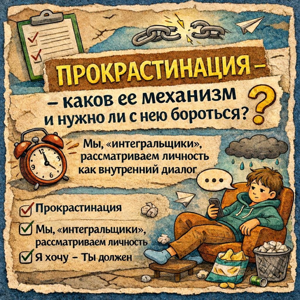 Мы, «интегральщики», рассматриваем личность как внутренний диалог между разными вариантами Я (хочу-должен) и ТЫ (хочешь-должен). По нашей теории существует всего лишь 8 типов таких диалогов. Прокрастинация относится к пятому типу - «Я хочу - ТЫ должен».