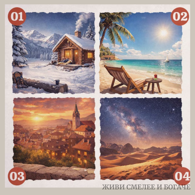 Не задумываясь, куда бы ваши мысли устремились в первую очередь? Вы бы спрятались в заснеженной хижине, позволили бы своим тревогам раствориться с каждой волной на тропическом пляже, побродили бы по мощеным улочкам старого уютного города или полежали бы под звездным небом пустыни? Я понимаю, вопросов много, но ваш первый, интуитивный выбор раскрывает ваш врожденный тип личности.