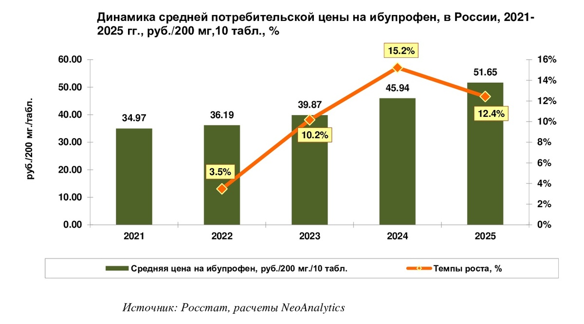 В ходе ежемесячного мониторинга розничных (потребительских) цен на ибупрофен, проведенного NeoAnalytics, выяснилось, что средняя розничная цена на лекарство в России за последние пять лет выросла в полтора раза, с 34,97 руб. за упаковку в 2021 г. до 51,65 руб. в 2025 г. Объектом исследования являются средние розничные цены на ибупрофен, 200 мг., 10 таблеток. Нестероидный противовоспалительный препарат. МНН: Ибупрофен. Торговые наименования: Бруфен, Бумидол, Некст Уно Экспресс, Нурофаст и т.п. По итогам 2025 г. средняя потребительская цена на упаковку данного медикамента увеличилась на 12,4% по отношению к аналогичному периоду годом ранее и составила 51,65 руб./200 мг. 10 табл. В 2025 г. было отмечено некоторое замедление роста средней цены. Но, тем не менее, в 2025 г. средняя цена достигла своего пика за период 2021-2025 гг. Помесячная динамика в ретроспективе периода 2021-2025 гг. показывает, что наиболее сильное подорожание было зафиксировано именно в последние два года. На федераль