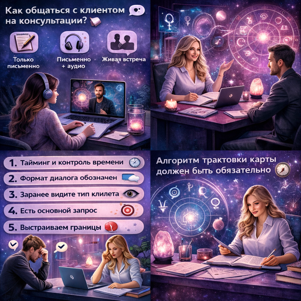 В работе астролога формат консультации играет ключевую роль. От того, как вы выстраиваете контакт, напрямую зависит доверие клиента, глубина разбора и желание вернуться повторно. На практике сегодня чаще всего встречаются три формата работы. 1) Только письменные разборы