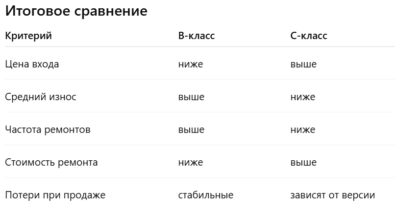 Многие считают: На практике всё сложнее. Меньше потерь – не всегда там, где дешевле вход. Разберём по ключевым параметрам. Но: Вывод: по цене входа B-класс проще, но риск купить изношенный экземпляр выше. Типичные ремонты: Плюс: ремонты чаще, но дешевле. Типичные ремонты: Плюс: ремонты реже при хорошем экземпляре. Вывод: по количеству ремонтов B-класс лидирует, по стоимости одного ремонта – C-класс дороже, но реже. Даже 3-5 лет – это часто уже сильно уставший автомобиль. Вывод: