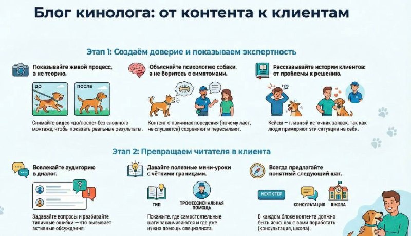Я не вела бы блог «про милых собачек». И точно не ограничивалась бы только клишейными командами «сидеть» и «лежать» или описаниями «как убрать какахи на прогулке» Потому что люди приходят к кинологу не за командами или тем, что итак можно загуглить. Они приходят за спокойствием, контролем и ощущением, что с их собакой всё можно решить. Кстати, если у вас есть непонимание, на какие вопросы можно ответить в блоге до того, как они будут заданы - идите на маркетплейсы и читайте там комментарии реальных людей, вопросы реальных людей и создавайте уникальный контент из реальных запросов А мы переходим к важному 👇🏻👇🏻 Мой блог кинолога строился бы вокруг трёх вещей: — реальных ситуаций владельцев — демонстрации процесса — понятного пути: от проблемы к результату 1. Видео с живым процессом, а не теорией Я регулярно показывала бы тренировки: — как собака тянет поводок — и как меняется поведение, — как реагирует на команды в начале — и что происходит через несколько занятий. — Короткие вид