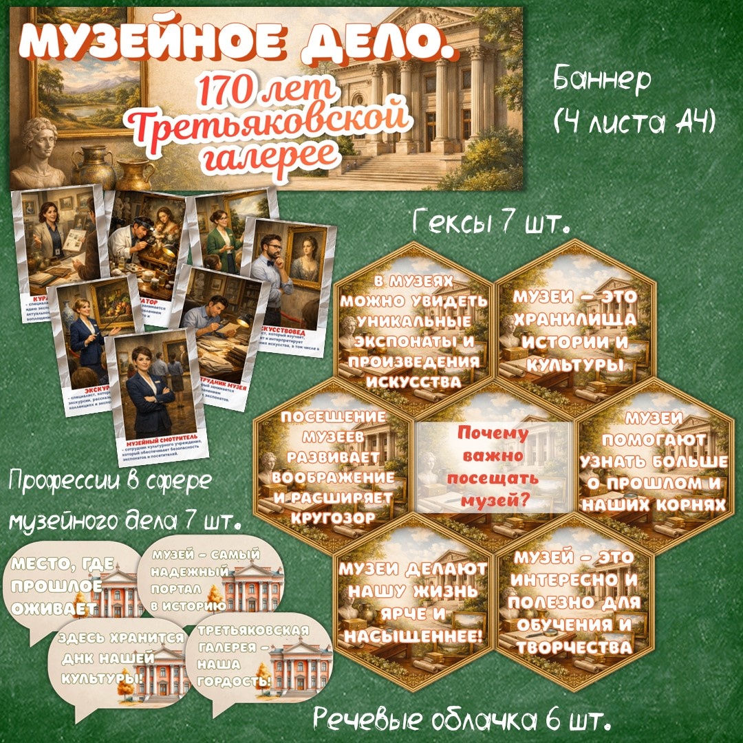 Оформление «Музейное дело. 170 лет Третьяковской галерее» для «Разговоров о важном», которые пройдут 19 января. Материал позволит создать атмосферу увлекательного и познавательного мероприятия, посвященного музейному делу и истории Третьяковской галереи. В набор для оформления входит: Подходит как украшение кабинета, школьной доски или информационного уголка для тематических классных часов и внеурочных занятий. Файл в PDF-формате на листах А4. В процессе печати можно настроить необходимый размер материалов согласно вашим предпочтениям и потребностям пространства кабинета. Еще материалы по теме:
