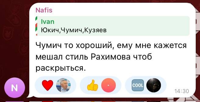: 1. Считает, что Чумичу мешала раскрыться схема Рахимова (мы согласны) 2. Уверен, что Рубин без больших денежных вливаний не построит чемпионскую команду (резонно) 3. Согласен, что раньше Рубин мог найти классных игроков задешево, не то, что сейчас (отчасти правда) 4. Думает, что Артига так себе тренер (о к а к) Достаем попкорн 🍿 ❤️ Злобный Рубин ❤️