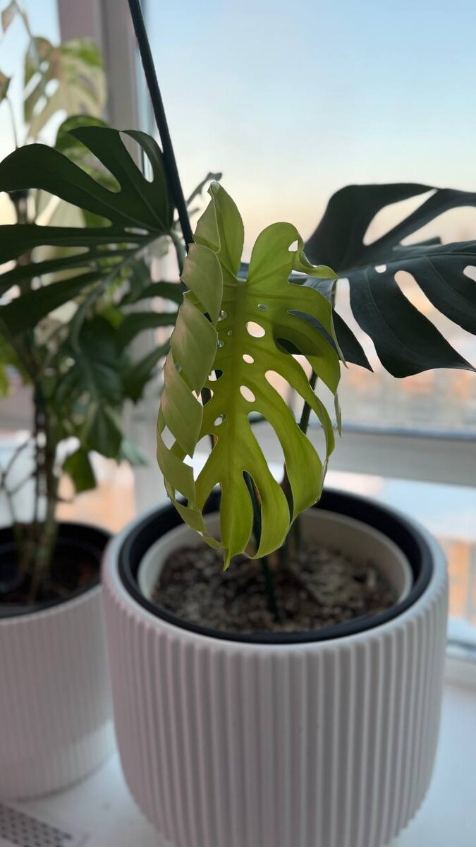 Зато новым листом радует деликатесная монстера 🥰 Он ещё не совсем развернулся, но уже красивущий 🌿