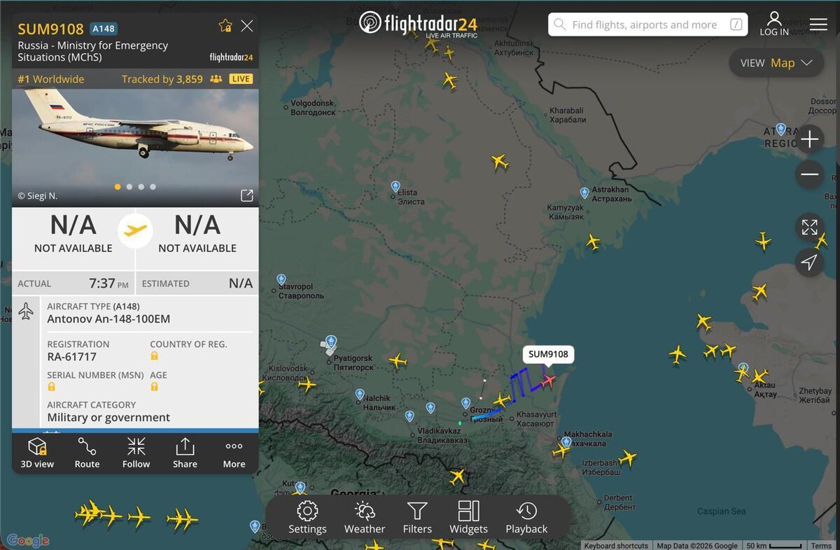 Checheniston yo‘nalishida tunda Moskvadan ikkita tibbiy reys qayd etildi Flightradar24 ma’lumotlariga ko‘ra, BAe 125-700A rusumli sanitariya biznes-jeti RA-02808 bort raqami bilan Moskvaning Jukovskiy aeroportidan parvoz qilib, janub tomonga yo‘l olgan. Shuningdek, Grozniy atrofida Rossiya Favqulodda vaziyatlar vazirligiga tegishli An-148-100EM samolyoti (SUM9108 reysi) kuzatilgan bo‘lib, u tibbiy evakuatsiya uchun foydalaniladi. @daryolive