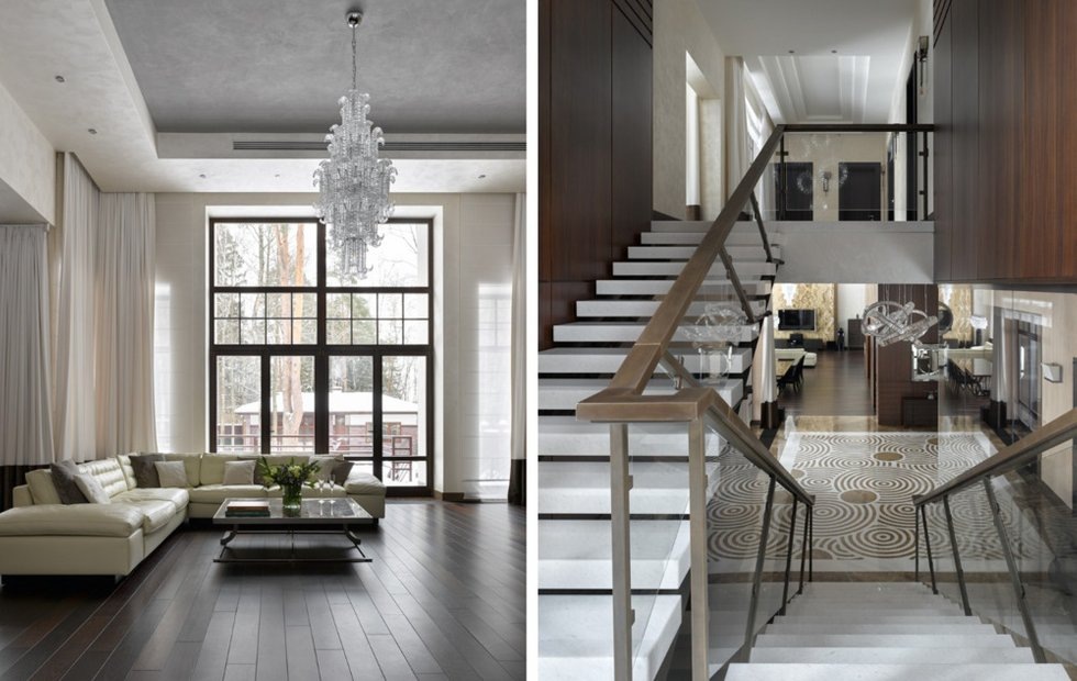 «Солидная площадь в 1200 квадратных метров, четырехметровые потолки и большие окна создают ощущение единения окружающего ландшафта и интерьера, — рассказывают авторы проекта. — Этот эффект мы усилили с помощью отделк. Использовали лучшие натуральные материалы: американский орех, мрамор, оникс, эбен, венге, палисандр, песчаник, черный сланец».