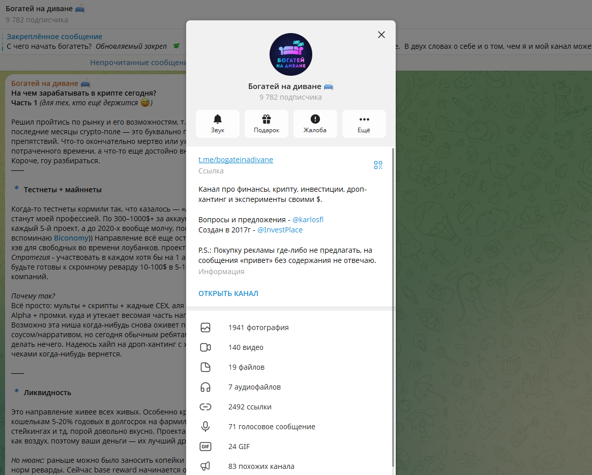 Именно так подаётся канал «Богатей на диване». Но при внимательном разборе становится видно: за образом спокойного крипто-блогера скрывается выстроенная система монетизации, где все риски аккуратно переложены на подписчика. Если вы предпочитаете более понятные и прозрачные форматы без приваток и «закулисья», можно посмотреть подборку проектов без сложных конструкций и размытых обещаний. Канал позиционируется как: Автор много рассказывает о своём пути, знакомых, кейсах, дропах и цифрах. Это создаёт эффект экспертности и доверия: «я давно в рынке — значит, понимаю больше».