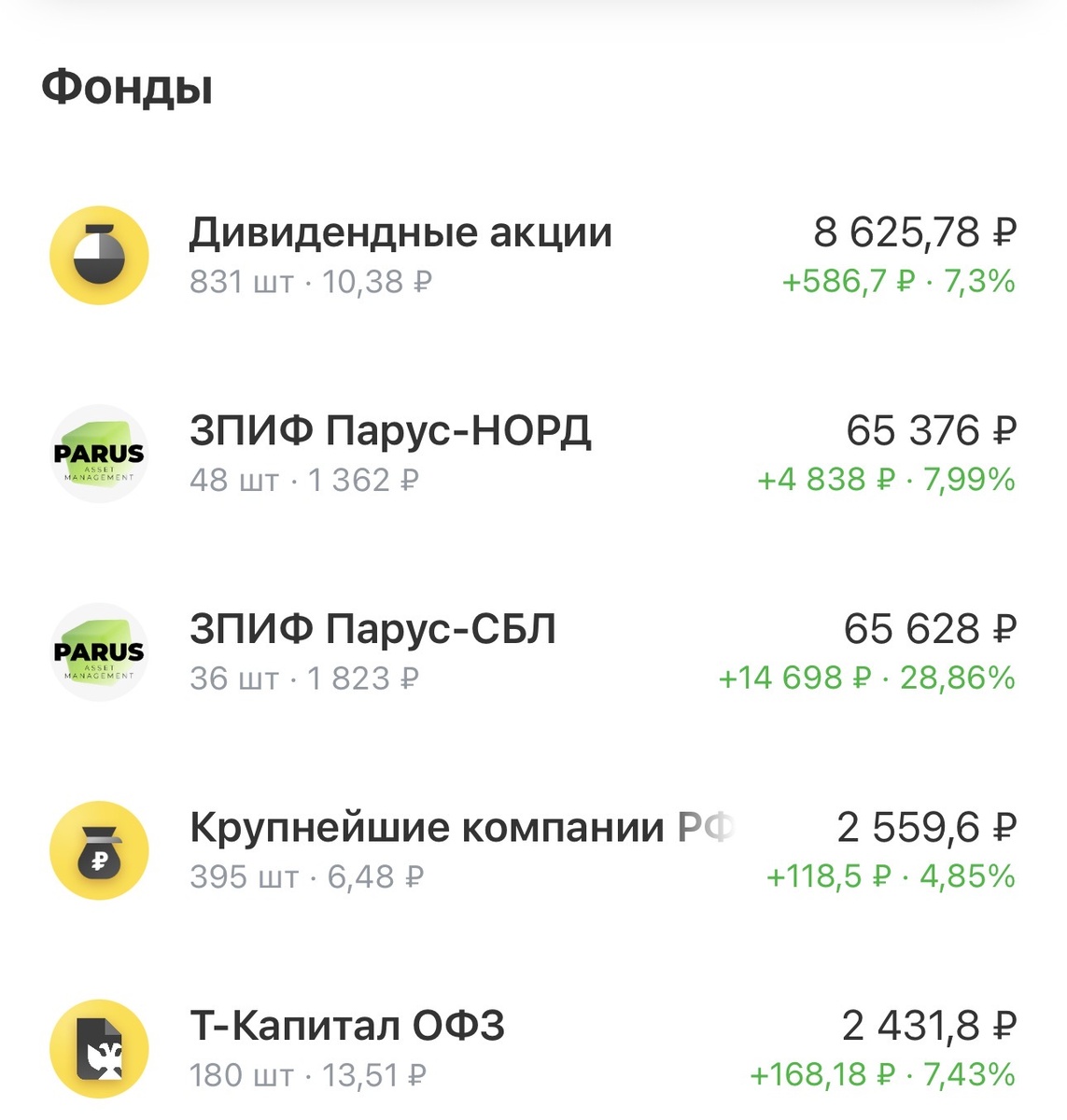 ☑️Фонды ликвидности, чтобы была возможность подержать деньги, под процент, пока копится необходимая сумма (из-за того что на счете используется маржинальная торговля с бесплатным лимитом в 5000₽, то покупать фонды нельзя)