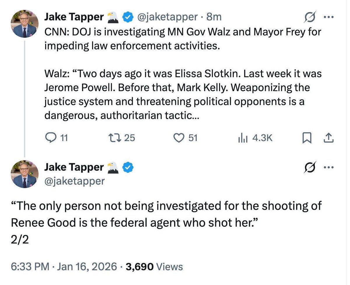 ‘Weaponizing the justice system and threatening political opponents is a dangerous, authoritarian tactic’ — Tim Walz after announcement of DOJ investigation ‘The only person not being investigated for the shooting of Renee Good is the federal agent who shot her’