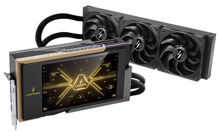 Одной из самых заметных особенностей этой видеокарты является встроенный 8-дюймовый цветной ЖК-дисплей. Это первое подобное решение на рынке видеокарт, которое открывает новые возможности для мониторинга и взаимодействия с устройством. С помощью дисплея можно выводить: