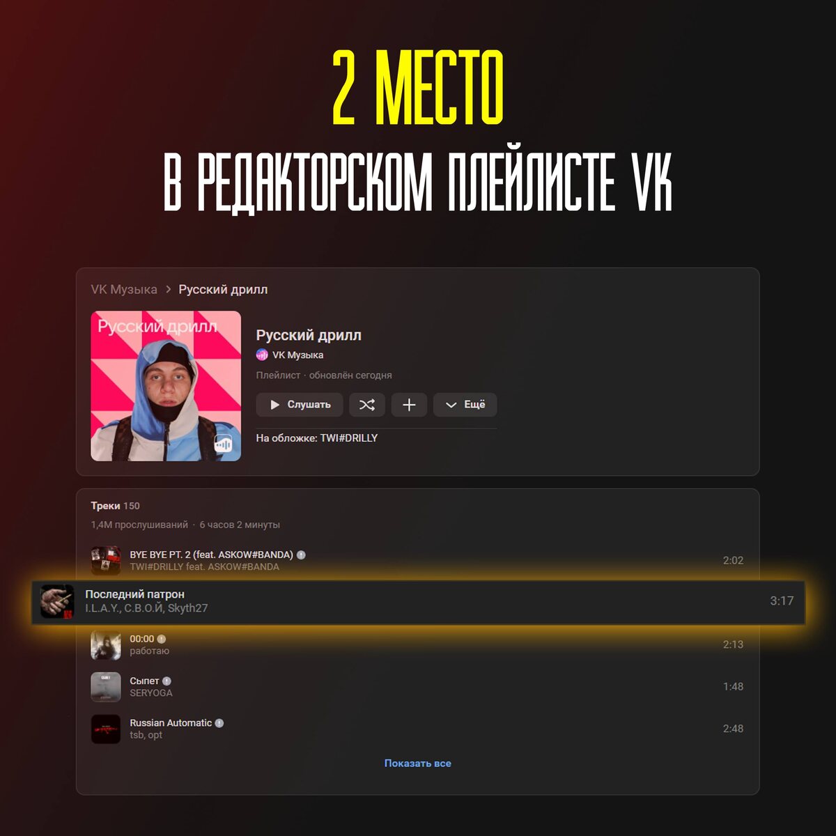 Наш трек Последний патрон на 2-м месте в редакторском плейлисте VK Русский дрилл🔥