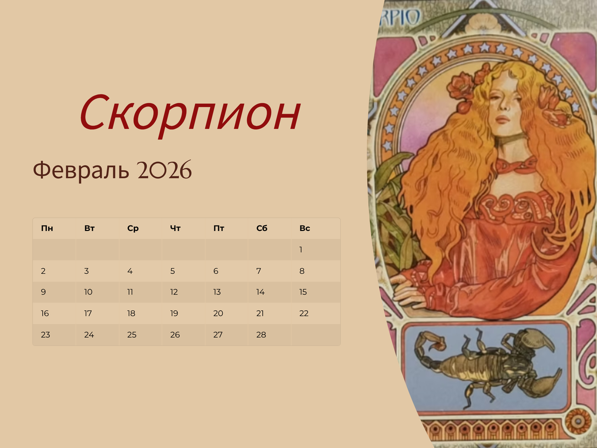 Каким будет февраль для Скорпионов узнаем у Таро. Мы посмотрим возможности и опасности месяца, события по основным сферам жизни и получим совет для Скорпионов на февраль месяц. Приветствую всех! Меня зовут Марина. Буду благодарна вашим лайкам и комментариям. Подписывайтесь, чтобы не пропустить новые прогнозы. Итак, давайте начинать! Возможности и опасности. Карта возможностей говорит о том, что в этом месяце вы поставите себе амбициозные цели. Это будет непросто, но стоит того, чтобы побороться за их реализацию. Карта опасностей говорит о необходимости обновления, очищения, избавления от лишнего и ненужного. Финансы. По финансам месяц не предвещает каких-то больших поступлений. Средств на самое необходимое хватит, но что-то лишнее приобрести, либо что-то отложить вряд ли получится. Отношения. Непростой месяц в отношениях. С одной стороны, грядут позитивные изменения, причём может произойти что-то неожиданное и приятное. Но, с другой стороны все это могут разрушить истерики, подозре