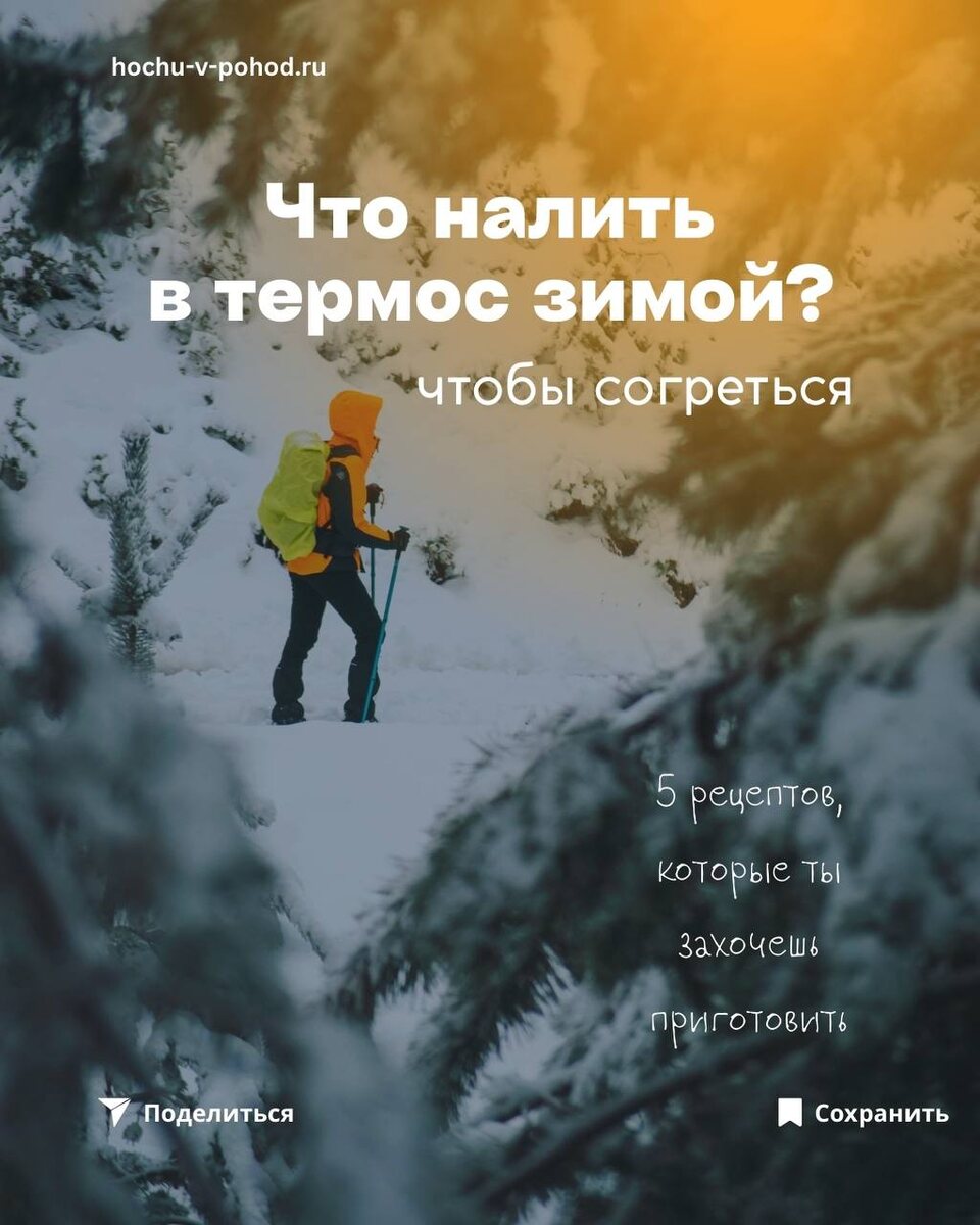 ❄ 🍷 Безалкогольный глинтвейн На 1 л: вишнёвый сок · апельсин · яблоко · корица · гвоздика Нагреть сок (не кипятить), добавить фрукты и специи, прогреть 10–15 минут → в термос. 🍫 Горячее какао На 500 мл: молоко · какао · тёмный шоколад · мёд Подогреть молоко, добавить какао и шоколад, размешать → в термос. 🍋 Имбирно-лимонный напиток На 1 л: вода · имбирь · лимон · мёд Имбирь залить горячей водой, настоять 10 минут, добавить лимон и мёд → в термос. 🍒 Ягодный морс На 1 л: клюква или брусника · вода · мёд Ягоды размять, залить горячей водой, добавить мёд → в термос. А что вы обычно берёте с собой зимой? Напишите в комментариях 👇