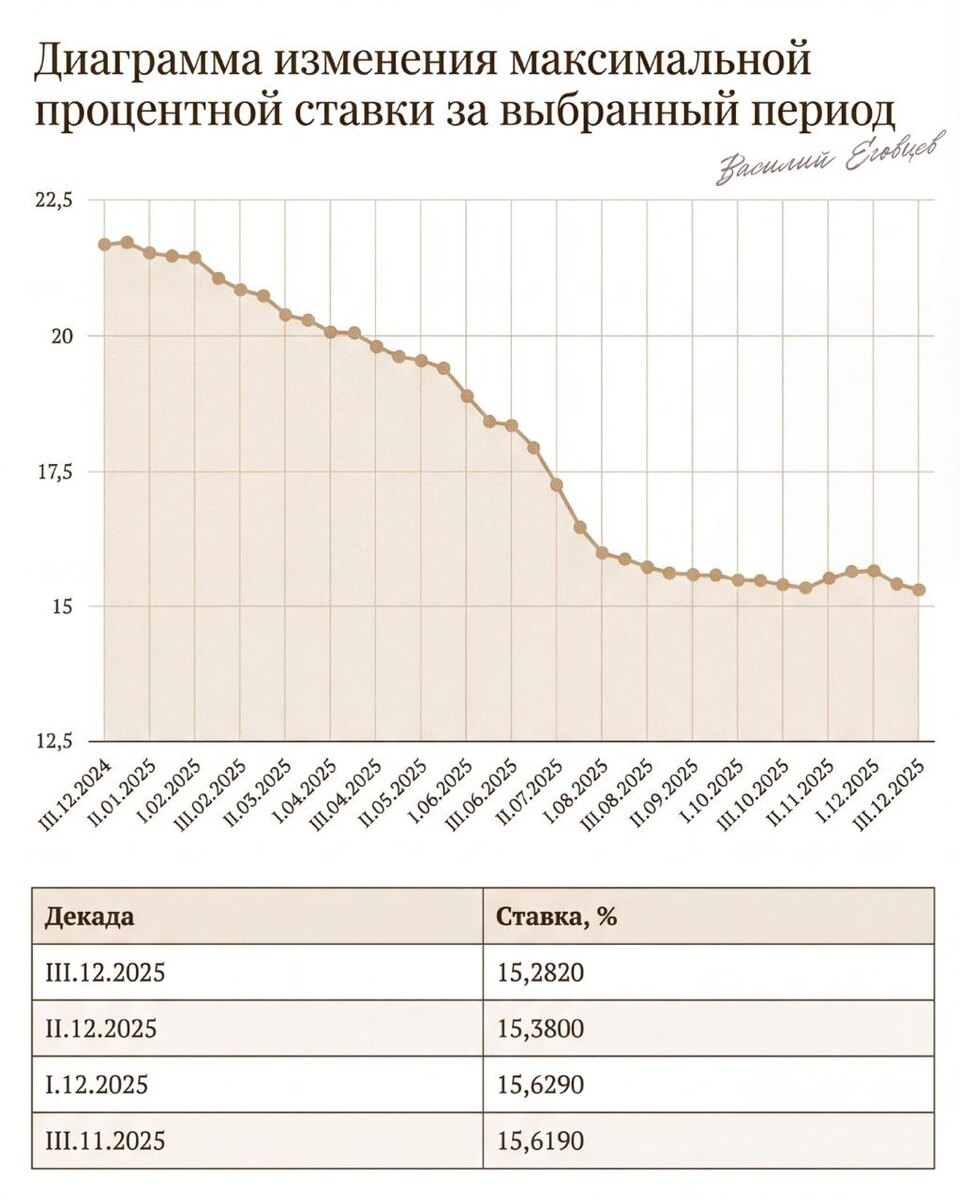 Пока вы ждали «идеального момента», пик доходности остался позади. Свежие данные ЦБ за III декаду декабря подтверждают: ставки пошли вниз. Максимальная ставка в топ-10 банков упала до 15,282%. Всего за 10 дней рынок «похудел» на 0,1%. Кажется, что мало? В масштабах капитала это ваши потерянные деньги. ——— Почему нужно фиксировать доход сейчас? Рынок уже отыгрывает снижение ключевой ставки. Банки не хотят платить лишнего и начали планомерную «стрижку» доходности: — Короткие деньги (до 90 дней): С 14,82% рухнули до 14,69%. — Среднесрочные (до полугода): Были 15,02%, стали 14,94%. — Годовые вклады: Потеряли сразу 0,2% и замерли на 14,20%. Тревожный звоночек: ставки на срок «свыше года» уже давно стоят на отметке 12,37%. Это то будущее, которое ждет все остальные вклады в ближайшие месяцы. Те, кто не успеет «запереть» свои деньги под 15% сейчас, скоро будут рады и двенадцати. Эти цифры от ЦБ — самая честная лакмусовая бумажка рынка. В них: — нет обязательных страховок и ПИФов; — усло