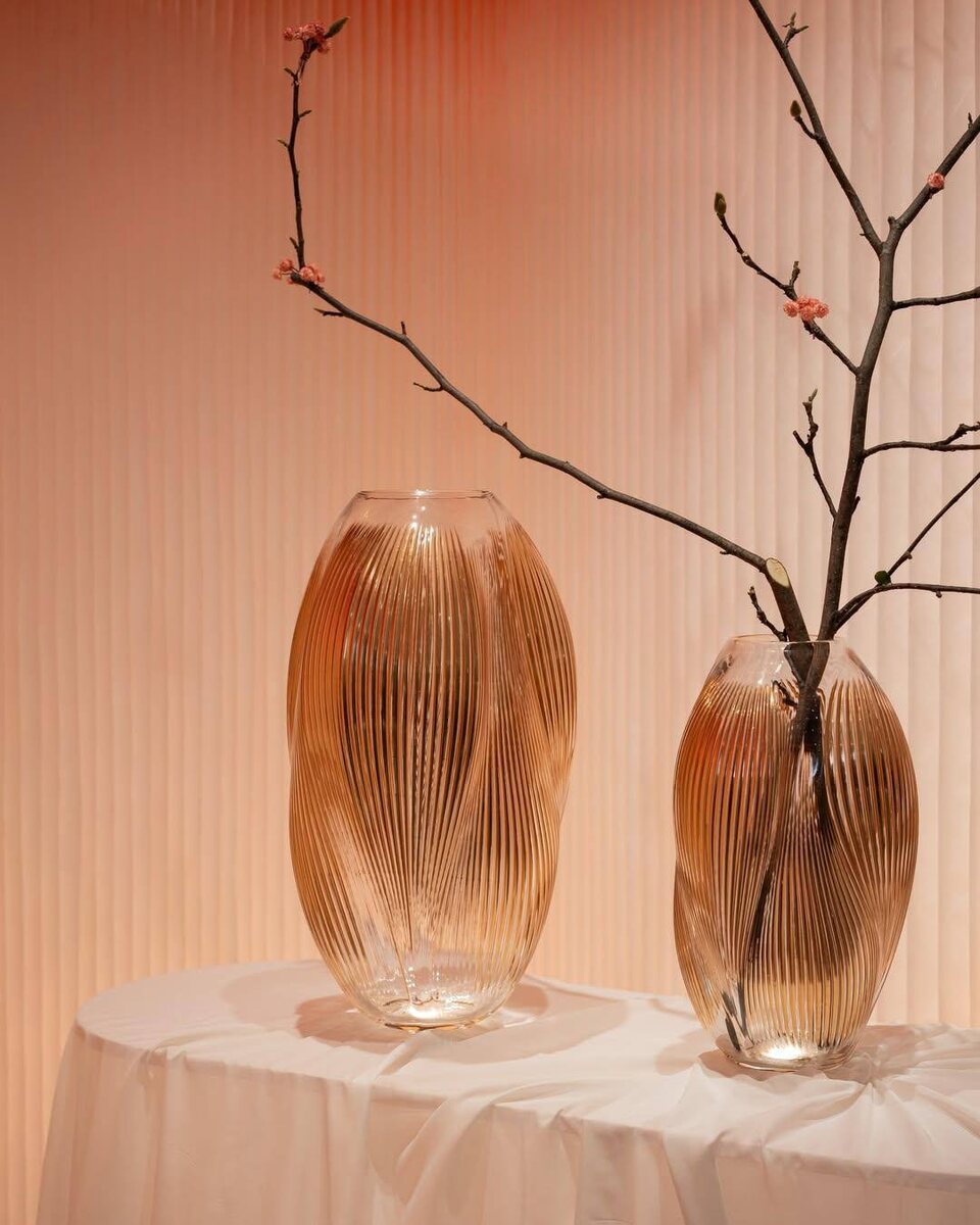 Вазы, чаши, подсвечники и лампы вдохновлены легким бризом. Плиссированный хрусталь в коралловых оттенках заката смотрится удивительно нежно.