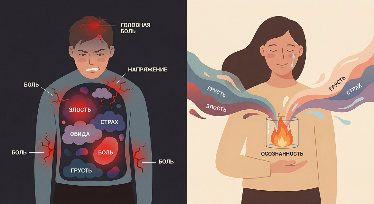 Представь, что каждая непрожитая эмоция — это мячик, который ты запихиваешь под воду. Один — легко удержать. Два — уже сложнее. Десять — ты тратишь все силы, чтобы они не всплыли.