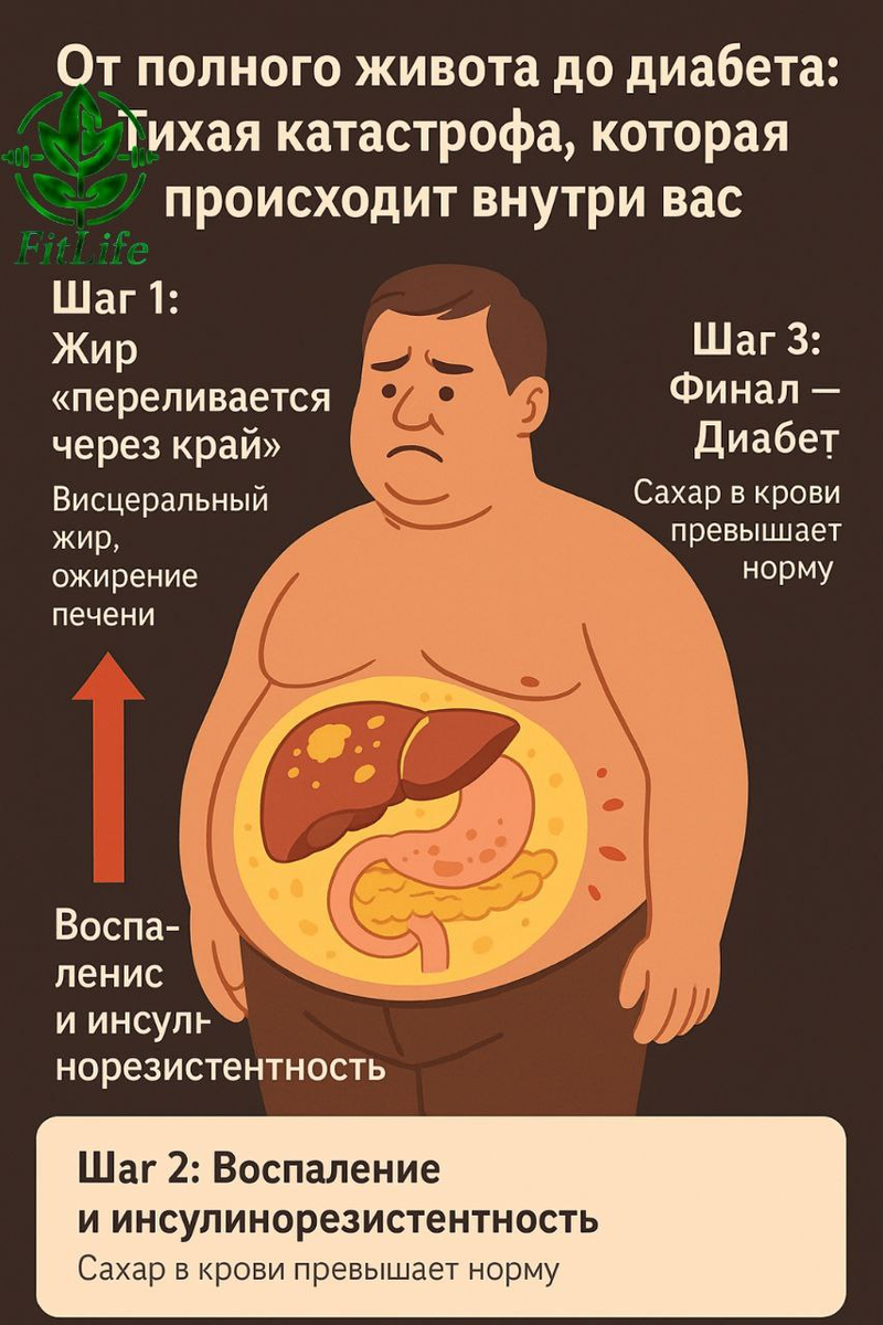 Ты когда-нибудь задумывался, что происходит, когда жировые клетки больше не вмещают ни капли жира? Это не просто лишний вес — это цепочка процессов, разворачивающихся постепенно и незаметно. Представь жировые клетки как контейнеры. Когда ты потребляешь больше энергии (особенно из углеводов), чем тратишь, эти контейнеры заполняются. И однажды они «сказывают»: хватит. Но калории продолжают поступать — и жир начинает откладываться в опасных местах: • вокруг внутренних органов (висцеральный жир) — обволакивает печень, сердце, поджелудочную; • внутри самих органов — ожирение печени и других тканей; • в мышцах — мешает их работе. Именно так появляется большой твёрдый живот. В тяжёлых случаях печень не справляется и может развиться асцит — скопление жидкости в брюшной полости. ⚠️ Висцеральный жир — это не бездействующий запас. Он выделяет вещества, провоцирующие хроническое воспаление. Чтобы защитить клетки от избытка сахара, организм включает механизм инсулинорезистентности: клетки хуже реаг