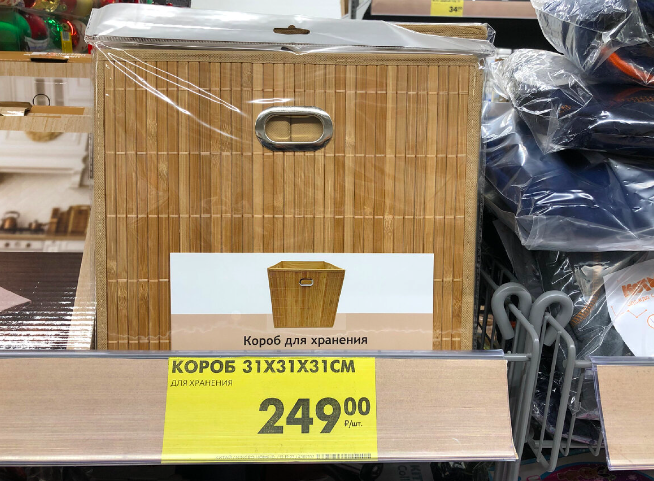 Начну с товаров для хранения и организации пространства. В продаже появились короба из бамбука размером 31 × 31 × 31 см. Они подходят для хранения одежды, текстиля, игрушек или различных мелочей. Красивый натуральный материал хорошо вписывается в интерьер. Стоимость такого короба составляет 249 рублей.
