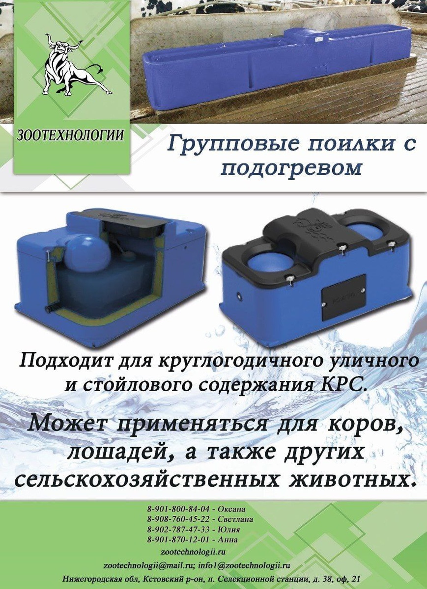 постоянным доступом к чистой и тёплой воде. Это важно для поддержания здоровья и повышения продуктивности животных. 🌡 Подогрев воды в поилке предотвращает замерзание и образование льда, что может привести к заболеваниям животных. Оптимальная температура воды, потребляемой КРС, должна соответствовать значениям в 15–17 °С. Некоторые преимущества использования пластиковых поилок с подогревом: 🔜Удобство и экономия времени. Поилка с подогревом обеспечивает постоянный доступ к тёплой воде, что позволяет сократить время на ежедневный уход за животными. 🔜Здоровье животных. Подогрев воды стимулирует потребление жидкости, что положительно сказывается на здоровье коров. Оставить заявку можно у наших менеджеров: Оксана: 8-901-800-84-04 Светлана : 8-908-760-45-22 Анна: 8-901-870-12-01 Юлия: 8-902-787-47-33 Будьте с нами ВКонтакте (https://vk.com/zootechnologii) 💥 #Групповые_поилки_с_подогревом