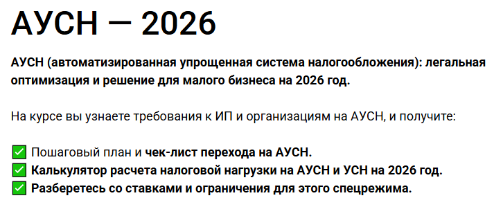 Друзья! Многие из вас, наверняка слышали, что с 2026 года для микробизнеса вводится НДС, т.е., если ИП (или ООО) на упрощенной системе налогообложения (УСН) за 2025 год, получило доход (вырчку) больше 20 млн руб, то с 2026 г. этот ИП (или ООО) обязано будет платить НДС Ко мне за последние 2 месяца обратилось огромное количество предпринимателей, чтобы узнать, что делать и как жить дальше? У большинства вопросы одни и те же, многим подходит режим АУСН (автоматизированная упрощенная система налогообложения), я даже хотел написать инструкцию, которая бы содержала ответы на большинство вопросов Но, к счастью, нашел довольно качественный курс по АУСН, который "закрывает" 99% вопросов. Причем стоимость курсов на этом сайте со скидками до 99%. С удовольствием делюсь с вами ссылкой: clck.ru/3RK7H9 На курсе вы узнаете требования к ИП и организациям на АУСН, и получите: