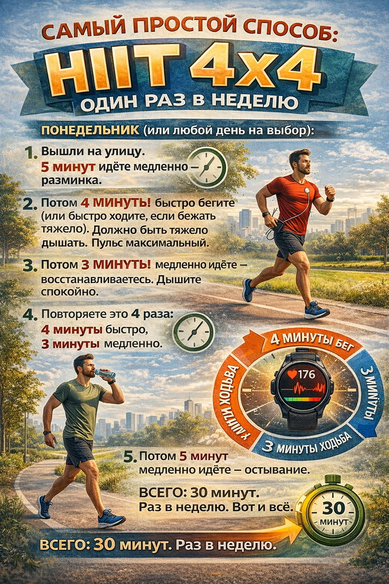 Понедельник (или любой день на выбор): Вышли на улицу. 5 минут идёте медленно — разминка. Потом 4 минуты быстро бегите (или быстро ходите, если бежать тяжело). Должно быть тяжело дышать. Пульс максимальный. Потом 3 минуты медленно идёте — восстанавливаетесь. Дышите спокойно. Повторяете это 4 раза: 4 минуты быстро, 3 минуты медленно. 4 раза. Потом 5 минут медленно идёте — остывание. Всего: 30 минут. Раз в неделю. Вот и всё. Остальные дни недели: просто лёгкие прогулки 30–40 минут, когда вы можете разговаривать. Или вообще отдыхайте. Через 8 недель VO2max вырастет на 7–8%. Через 20 недель — на 15%. Главное — раз в неделю не пропускать этот 30-минутный HIIT.