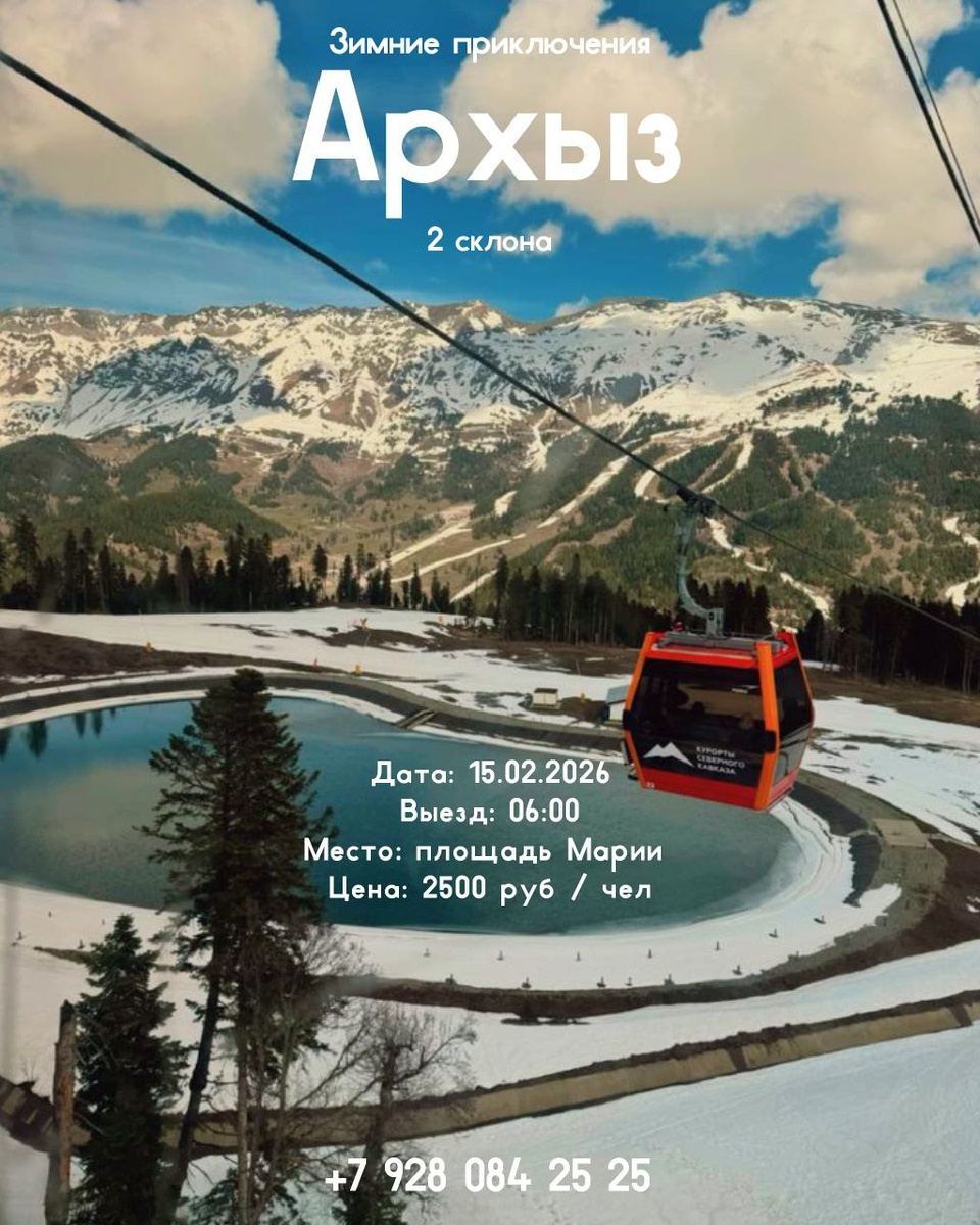 💙💙💙💙💙💙⛄💙 ❄️ Архыз — магия и волшебство снежных гор! ❄️ Приглашаем вас на незабываемый однодневный выезд в удивительный Архыз 15 февраля 2026 года! 🚗 В 6:00 утра мы отправимся в путь на комфортном микроавтобусе, чтобы наполниться свежим горным воздухом, почувствовать всю мощь и красоту Кавказа. 🏔️ За день вы увидите: Южный и Северный склон, где открываются панорамные виды со смотровых площадок на необычайные пейзажи, которые останутся в памяти навсегда. 💰 Стоимость — всего 2500 рублей с человека. В цену входит: трансфер, сопровождение и яркие впечатления. (Канатная дорога оплачивается дополнительно.) 🚠 Восхитить вас сможет подъем на канатной дороге к ледниковым пикам, где ощущение, что ты на вершине мира! Дополнительные расходы : - Канатная дорога на 2 склона - 2900 руб/чел - Питание - Личные расходы 🏠 Вернемся примерно в 23:00, наполненные энергией, эмоциями и новыми открытиями! 🎄Не упустите возможность провести этот зимний день в сказке, полную красоты и вдохнове