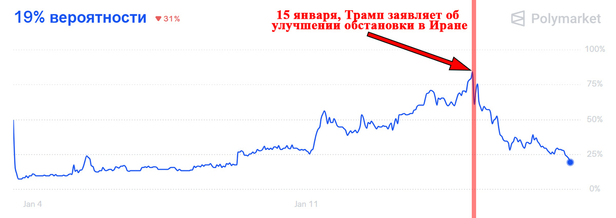 Цены на нефть на фоне спада напряженности обваливаются, на политическом тотализаторе Polymarket вероятность ударов по Ирану со стороны США до начала февраля оценивается в 19%, вместо пиковых 86%.