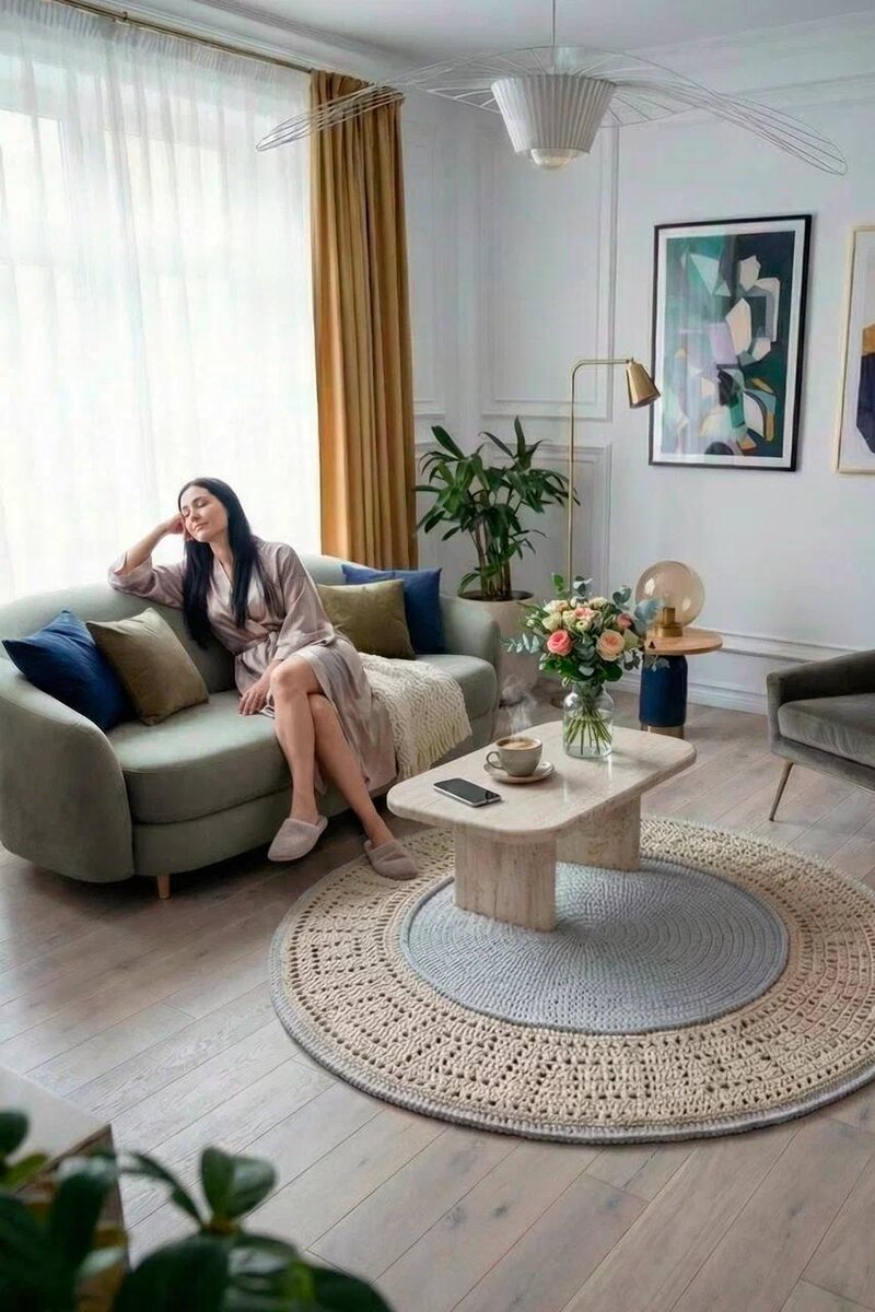 😉 Так вот, для тех, кто ещё не в теме: промпт - это специальный текстовый запрос для ИИ (искуственного интеллекта), подробная инструкция словами. Что именно должно быть на картинке, в каком стиле, с каким светом, фактурами и без самодеятельности нейросети. А теперь, что на самом деле я проделала, чтобы получить готовые промпты для ковров🙃 1 Найти нейросеть, которая вообще умеет вставлять готовый предмет в интерьер. Спойлер: 90% нейросетей радостно рисуют ковры совершеннолевые, незнакомые, а не те, которые я им показала 2 Найти к ней доступ (к нейросети) Когда находишь нужную - оказывается, что она: а) не работает в моей стране, б) работает, но через танцы с бубном, в) работает, но в прошлогодней версии 3 Первая радость и первое разочарование Ковер в интерьере есть! Правда, не мой )) Мой аккуратный вязаный ковер внезапно превратился в «фантазию нейросети на тему, что-то пушистое и волнистое» ИИ считает, раз есть слово "вязаный" то это именно так должно выглядеть 4 Я добилась им