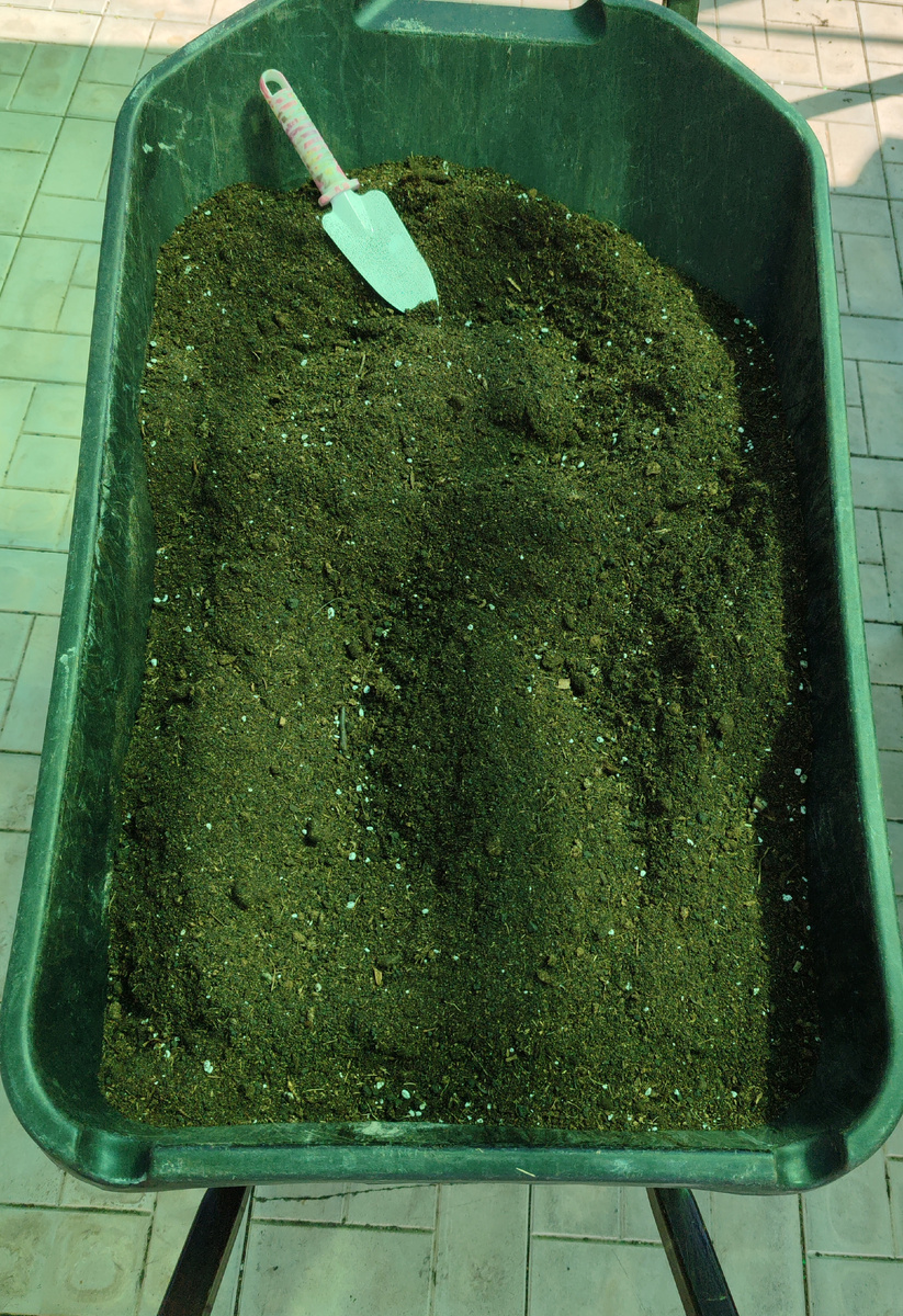 На фото: Мой «промышленный» способ: готовлю грунт для посадки сразу в большом объеме. Мне нужно заполнить много кашпо, поэтому замешиваю компоненты в строительной тачке. Отмеряю всё ведрами, тщательно перемешиваю лопатой — и в итоге получается однородная, легкая и воздушная смесь, идеальная для корней петунии.