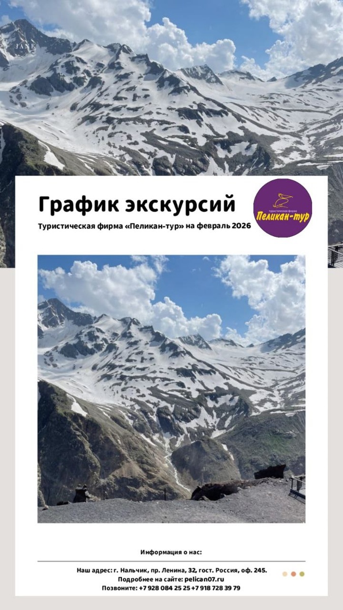 🤍🤍🤍🤍🤍 🤍Планируете замечательные поездки и экскурсии? Тогда наш график точно для вас! Каждую неделю у нас вас ждут уникальные маршруты и впечатляющие места по всему Кавказу и не только! Вот что вас ожидает: 🔹Понедельник (2, 9, 16, 23 февраля 2026) Голубые озера + Аушигер Верхние и Нижние Голубые озера + термальный источник Аушигер (доп. купание — 500 руб.) 🕐 13:30-18:00 | 1200 ₽ 🔹Вторник (3, 10, 17, 24 февраля 2026) Обзорная экскурсия по г. Нальчик + Шато Эркен Памятники, замок, смотровая площадка, кондитерский магазин и храм 🕐 13:30-18:30 | 1100 ₽ 🔹Среда (4, 11, 18, 25 февраля 2026) Эльбрус и Три Поляны Поляна Азау, Чегет, Нарзаны 🕗 07:00-18:00 | 1800 ₽ Джип-тур: Эльтюбю Дорога к Кайсыну, смотровые, сакля Кулиева 🕑 12:00-18:00 | 2500 ₽ 🔹 Четверг (5, 12, 19, 26 февраля 2026) Чегемское ущелье Теснина, водопады, серебряный источник, водопад Абай-Су 🕐 13:30-18:00 | 1200 ₽ Кавказское застолье в ресторане Сосрукто 🕔 17:30-20:30 | 2800 ₽ 🔹 Пятница (6, 13, 20, 27 фев