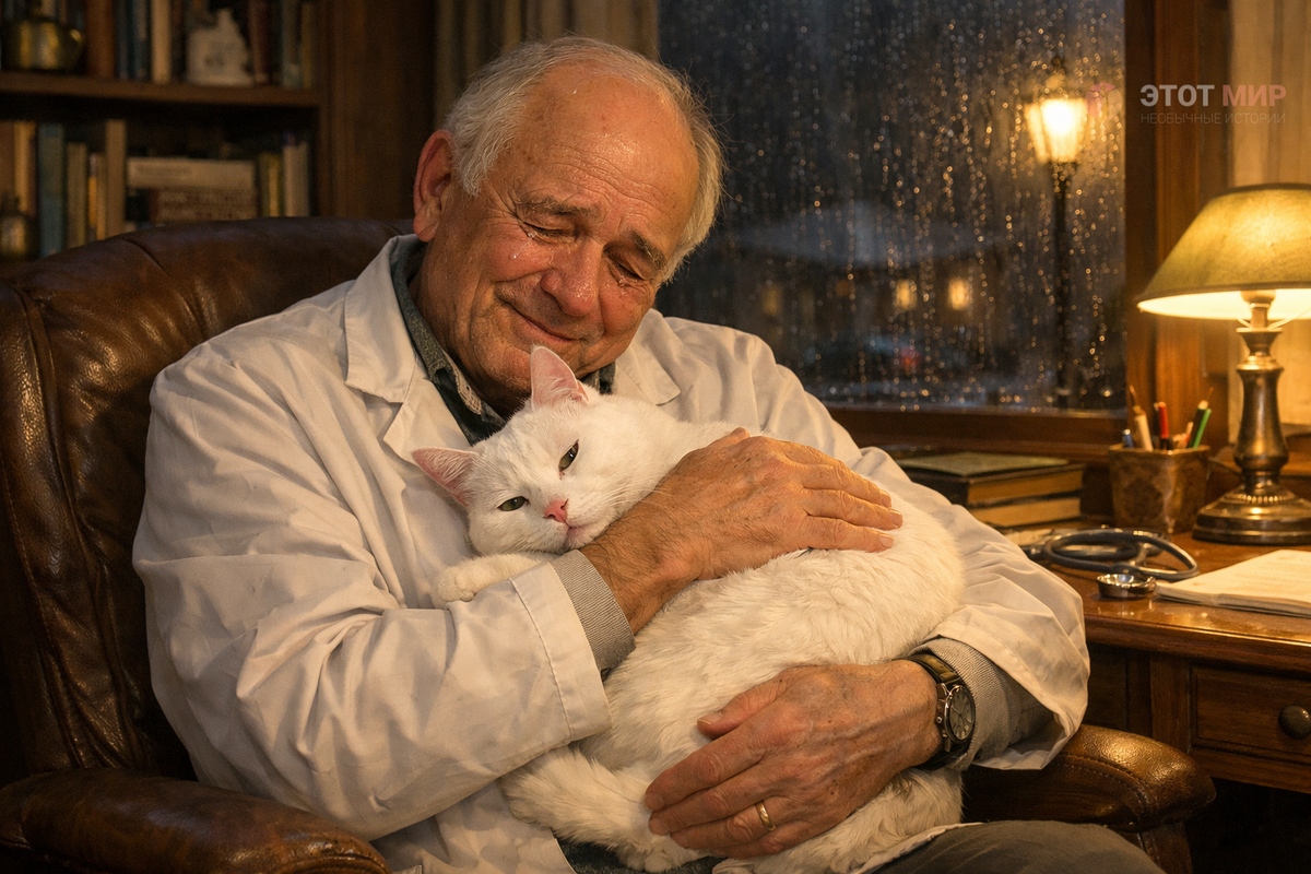 Врач в белом халате и белый кот в его руках выглядели как портрет абсолютной уязвимости.