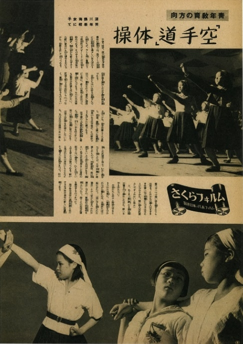 Asahi Graph (яп.アサヒグラフ Асахигурафу), также известный как Asahi Picture News - японский еженедельный иллюстрированный журнал, выходивший с 1923 по 2000 год. Он начинался как ежедневное приложение к Asahi Shinbunsha, но вскоре стал еженедельным изданием. В номере от 22 октября 1941 года (Vol. 37, No. 17) есть маленькая статья о том, как каратэ преподавалось в школе для девочек в Фукагава( 深川), которая сейчас является районом Кото, Токио. Статья называется «Направление воспитания молодежи. Гимнастика каратэ» (空手道体操, каратэ-до тайсо). Статья иллюстрирована черно-белыми фотографиями молодых девушек, отрабатывающих приёмы каратэ и упражнения с партнерами в рамках своего физического воспитания. Они одеты в школьную форму, а не в обычную форму каратистов. Это очень хорошо показывает, насколько важным каратэ уже стало в Японии, что, без сомнения, является большим достижением Фунакоси Гитина (1868-1957), который продвигал своё искусство на материковой части Японии с 1922 года. На одной из фотогр