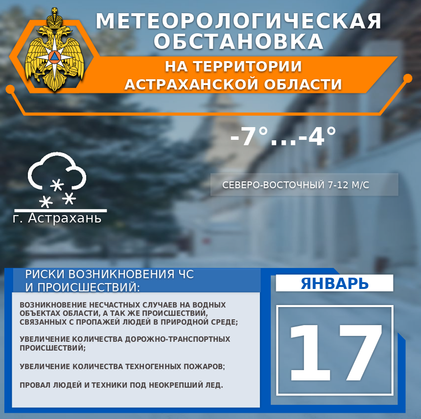 По г. Астрахань облачно. Небольшой снег. Ветер северо-восточный 7-12 м/с. Температура воздуха -7…-4°. На дорогах гололедица, снежные заносы.